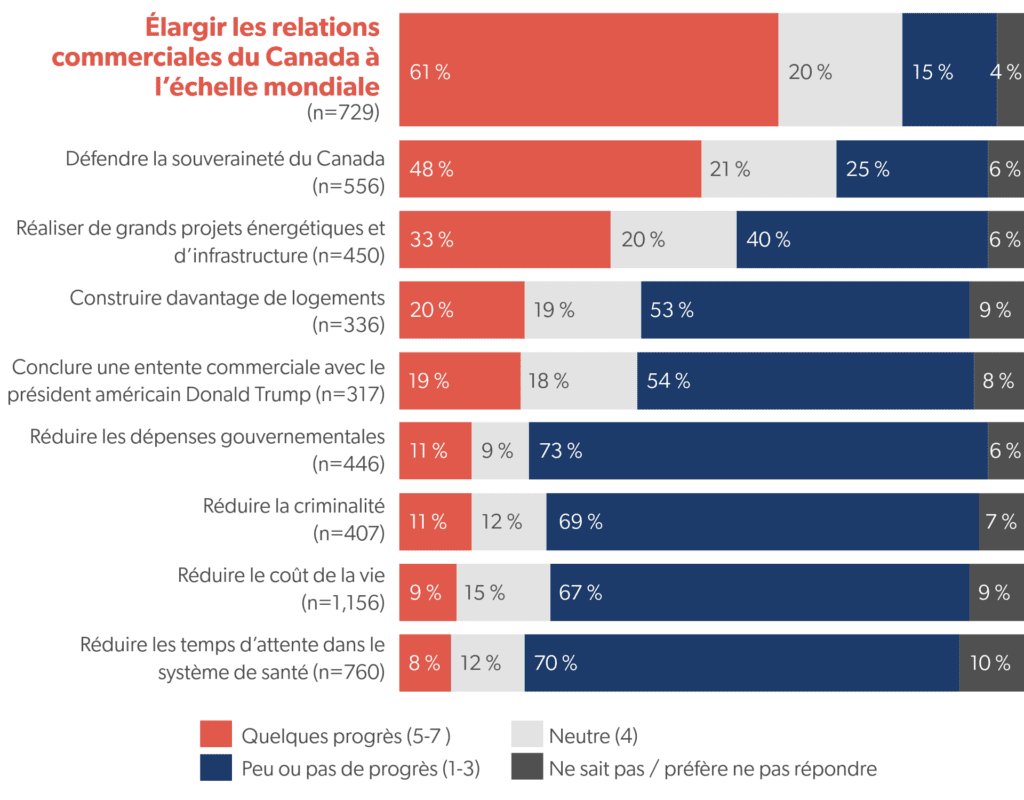 Au milieu de l’intensité des événements internationaux, nous avons voulu sortir de la bulle médiatique et mieux comprendre ce que les Canadiens pensent que leur gouvernement devrait privilégier cette année. Par le biais du sondage omnibus d’Earnscliffe, nous avons demandé aux Canadiens quelles priorités le gouvernement de Mark Carney devrait privilégier et quels progrès son gouvernement a réalisés à ce jour sur ces questions.