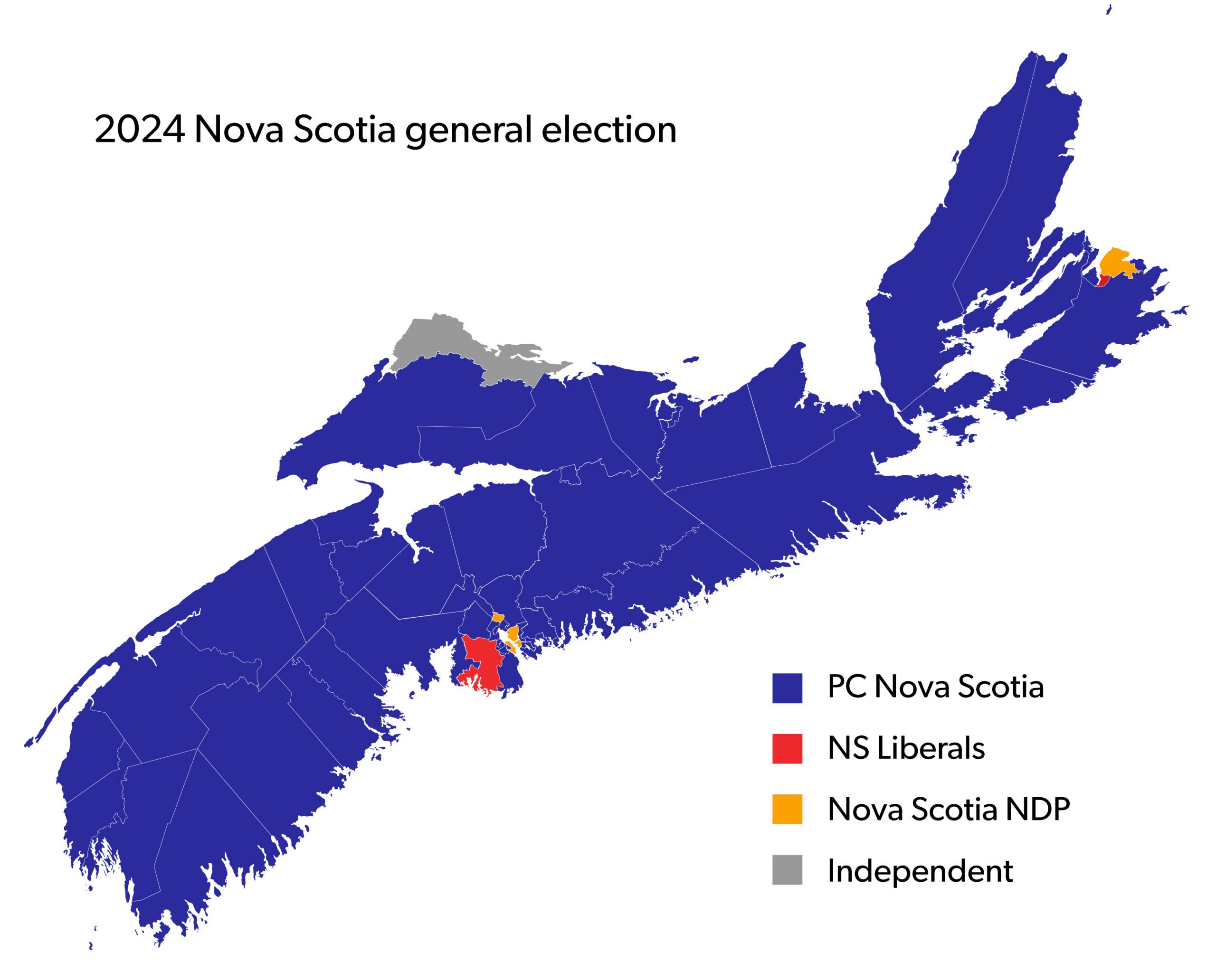 Tim Houston’s Progressive Conservative government was re-elected with a landslide record majority, winning 43 of the Nova Scotia legislature’s 55 seats, more than any other PC government in the province’s history. Yesterday’s result is the largest majority of seats as a percentage of the total legislature since PC John Buchanan’s win forty years ago in 1984. No party has won a larger percentage of the popular vote (52.8%) since Robert Stanfield’s victory in the 1963 provincial election.