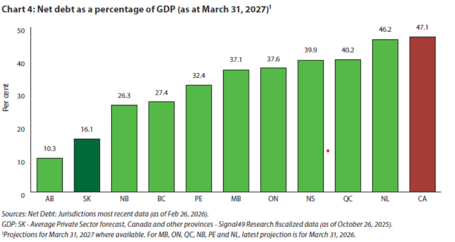 Nationally, Saskatchewan is still projected to have the second-lowest debt-to-GDP ratio in the country. This is also reflected in the province’s debt per capita, which stands at $641 per resident. By comparison, other western provinces that have recently tabled budgets with significant deficits report much higher figures: Alberta at $1,864 per capita and British Columbia at $2,340 per resident.