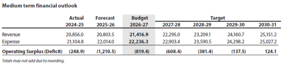 Total revenue is forecast to increase steadily over the medium term, rising from $21.4 billion in 2026, to $22.3 billion in 2027, and $23.2 billion in 2028. Over the same period, expenses are also expected to grow from $22.2 billion in 2026, to $22.9 billion in 2027, and $23.6 billion in 2028. The government has charted a difficult path back towards a balanced budget but does not reach one until 2030-31. For 2026‑27, the Budget projects a deficit of $819 million, narrowing to $608 million in 2027-28, and $381 million in 2028-29.