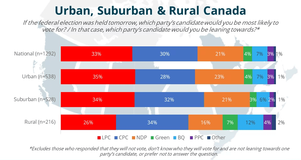 Last week, we highlighted the large (11%) lead the Liberal Party enjoyed in vote-rich suburban Canada. In one week, the lead has basically disappeared, with Liberal support now at 34% and Conservatives at 32%.