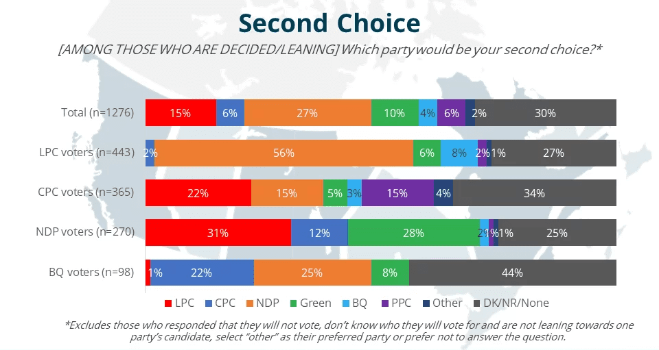 Current NDP supporters, on the other hand, are divided over whether the LPC (31%) or the Green Party (28%) would be their second choice and 12% name the CPC.