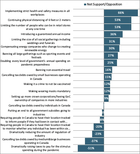 In fact, what we find is that the Canadian population is actually comprised of three equally-sized segments of opinion when it comes to support or opposition to this list of possible public policy responses:
