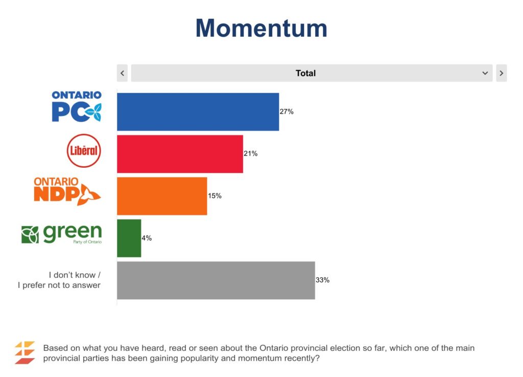 To get a better sense of voters’ impressions of which party is ahead/behind, we asked respondents which of the main provincial parties they felt was gaining momentum. Notably, a third (33%) are not sure or do not offer an answer, suggesting that many are not following the campaign closely. About a quarter (27%) say the PCs are gaining momentum. One-in-five (21%) say the Liberals, 14% the NDP and 2% the Greens. For most the most part, results are highly correlated with current vote intention. Over half of PC (60%) and Liberal (56%) voters believe their party is gaining momentum. NDP voters are less bullish about their party’s changing fortunes, though still 44% say the NDP is gaining momentum.
