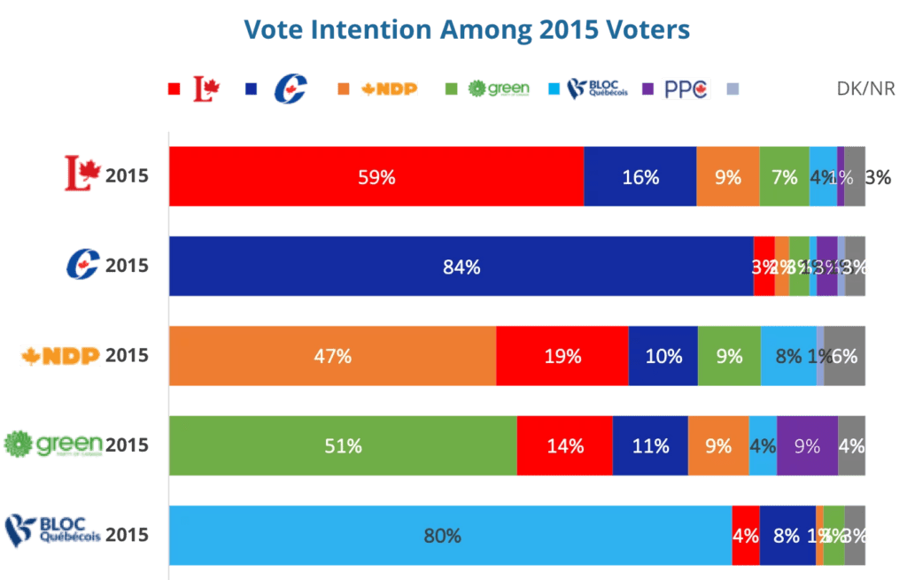 In many ways, the party that has benefited the most from this post-2015 realignment has been the BQ. Only half of their current supporters voted BQ in 2015, with the remainder comprised almost entirely of former Liberal (21%) and NDP (16%) voters.