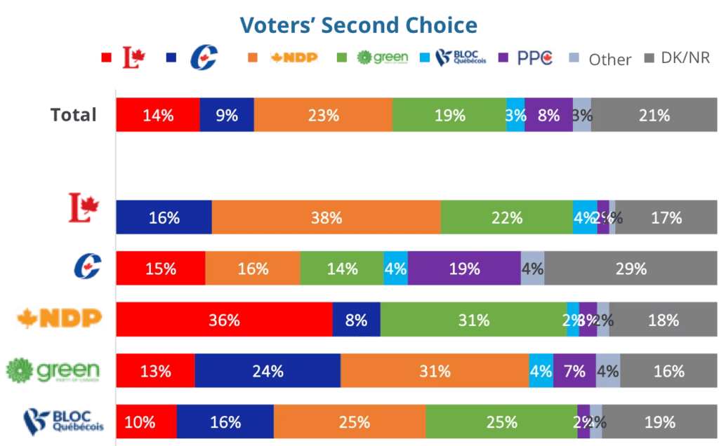 At 10% current national support, Green Party second choice does not really factor into any significant recalculation of possible voter re-alignment. If their voters were to defect, the NDP would benefit the most, but only to the upward-most possibility of 3% of the total popular vote. Similarly, a complete collapse of the Green Party would only add 1% to the Liberals and 2% to the Conservatives popular vote.
